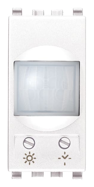 Interruttore con sensore di presenza ad infrarossi per accensione luci, soglia del sensore crepuscolare e ciclo di temporizzazione regolabili, uscita a relè NO 6 A 230 V~, alimentazione 230 V~ 50-60 Hz, bianco