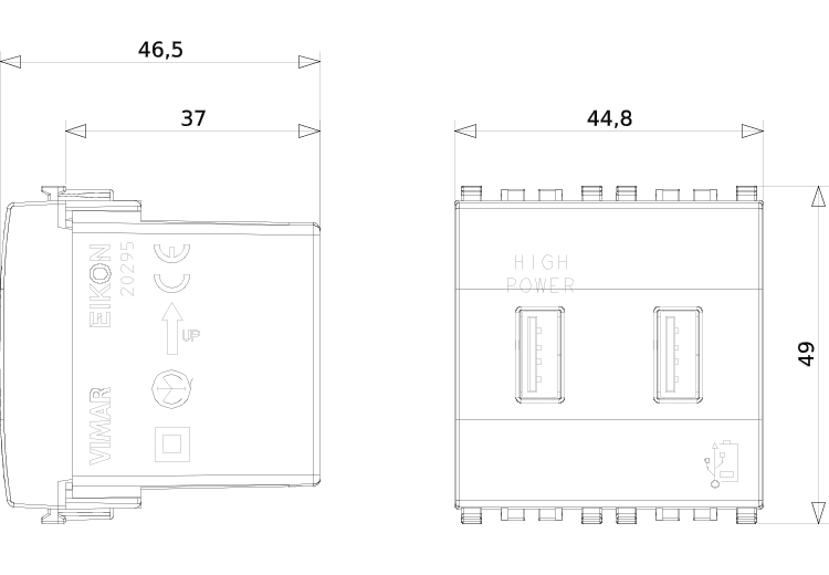 Unità di alimentazione 5 V 2,1 A per dispositivi elettronici, 2 uscite USB frontali, alimentazione 120-230 V~ 50/60 Hz - 2 moduli. Il dispositivo va utilizzato per ricaricare i telefoni cellulari e tutti gli apparecchi elettronici che offrono la possibilità di ricarica da una qualsiasi presa standard USB. Il dispositivo permette di ricaricare due apparecchi contemporaneamente.