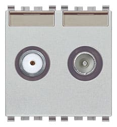 Presa coassiale TV-RD-SAT, 5-2400 MHz, passante, demiscelata, 2 uscite con connettore maschio (TV-RD) e connettore tipo F femmina (SAT), attenuazione di derivazione 10 dB, Next - 2 moduli