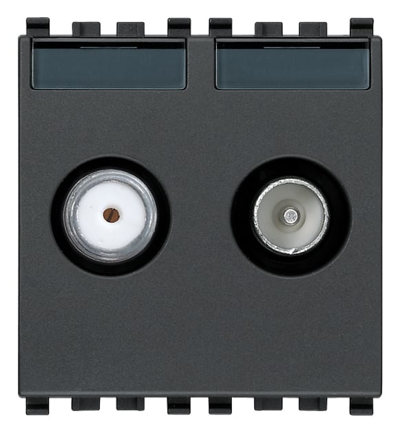 Presa coassiale TV-RD-SAT, 5-2400 MHz, passante, demiscelata, 2 uscite con connettore maschio (TV-RD) e connettore tipo F femmina (SAT), attenuazione di derivazione 10 dB, grigio - 2 moduli