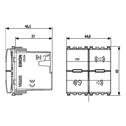 Microfono per chiamata selettiva o generale, funzione di attivazione con la voce per il controllo dei bambini (Baby Control) e ascolto ambientale - 2 moduli. Il dispositivo permette di rilevare e trasmettere sul bus del sistema di diffusione sonora il segnale vocale captato dal microfono frontale in modo da attivare le funzionalità di Chiamata Generale, Chiamata Selettiva, Baby-Control o Ascolto Ambientale. In caso di chiamata le zone coinvolte diffondono il segnale audio relativo alla chiamata stessa; al termine di quest’ultima ogni zona riprende il funzionamento immediatamente precedente alla chiamata. Il tasto basculante destro inoltre, può anche essere configurato per effettuare funzioni diverse da quelle standard di Chiamata Generale e Selettiva e può essere utilizzato come comando automazione (controllo luci, tapparelle, ecc.) o per altre funzioni audio legate alla diffusione sonora. Next.