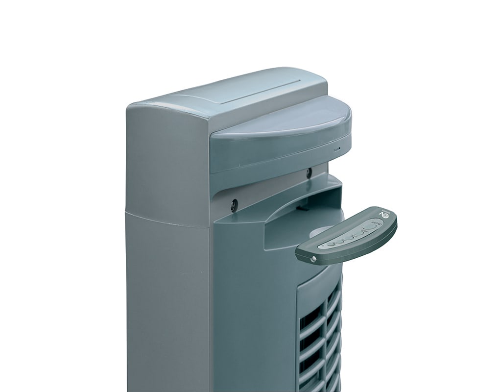 Ventilatore pluridirezionale da terra, serie Ariante Tower. Ventilatore di nuova generazione; oltre all’estetica originale garantisce un effetto rinfrescante anche a lunghe distanze. Design innovativo, si adatta ad ogni ambiente. Involucro esterno, base,girante tangenziale, coclea e telecomando in resina termoplastica (ABS). 3 velocità selezionabili. 3 modalità di funzionamento: modalità standard: il ventilatore funziona alla velocità impostata; modalità brezza: la velocità muta automaticamente dalla massima alla minima velocità creando un effetto “brezza”; modalità notte: la velocità di funzionamento diminuisce automaticamente ogni 30 minuti adattandosi alla diminuzione della temperatura notturna. Funzione Timer permette l'impostazione dello spegnimento ritardato ad intervalli di 30 minuti fino a un massimo di 7.50 ore. Telecomando a raggi infrarossi permette di azionare a distanza le seguenti funzioni: accensione/spegnimento, velocità di rotazione della girante, le 3 modalità di funzionamento e il Timer. Pannello di controllo con spie luminose, in corrispondenza della parte superiore del ventilatore, che evidenziano la modalità di funzionamento impostata. Gruppo comandi con tasti del tipo “soft touch” posto alla sommità del prodotto e protetti da coperchio con chiusura ammortizzata replicano le funzioni del telecomando. Rotazione 60°. Cavo di alimentazione lungo 2 m. Isolamento: Cl. II .