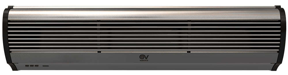 Barriere d’aria per installazione orizzontale fissa in corrispondenza delle porte e, più in generale, delle zone di accesso di locali pubblici, negozi, supermercati o centri commerciali, generano una lama d’aria che ostacola l’ingresso di aria esterna a temperatura diversa da quella desiderata. Particolarmente indicate anche per prevenire l’ingresso di fumo, smog o insetti ed evitare la diffusione di odori tra ambienti contigui. Involucri caratterizzati da pannelli frontali in alluminio spazzolato di colore grigio argento integranti la griglia di aspirazione; pannelli posteriori in lamiera d’acciaio verniciata nera; fianchetti in resina plastica nera. Ventilatori tangenziali, a garanzia di bassi livelli di emissioni sonore, azionati da motori asincroni bialbero a due velocità per il miglior compromesso tra prestazione erogata, temperatura del flusso d’aria generato (nel caso dei modelli con batteria elettrica), e livello di emissione sonora. 2 velocità di funzionamento. I modelli AIR DOOR H hanno batterie elettriche a termoresistori (PTC) caratterizzate da elevate rese termiche e ridotta resistenza aerodinamica, protette contro sovratemperature e picchi di tensione. La specifica logica di funzionamento, che ritarda di 30” l’arresto del ventilatore dopo lo spegnimento della resistenza, contribuisce al loro affidabile funzionamento nel tempo. Alette orientabili, montate in corrispondenza della zona di fuoriuscita dell’aria, permettono di orientare il flusso generato. Consentono risparmio nei consumi perchéevitano la creazione di variazioni termiche e di dispersioni: anche i climatizzatori (in estate) o i riscaldamenti (in inverno) lavorano in modo più efficace, risparmiando a loro volta il proprio consumo. Sono utilizzabili in tutte le stagioni: sono modelli in versione neutra. Grande flessibilità di installazione: la posizione frontale della griglia di aspirazione consente il montaggio anche a ridosso del soffitto nei locali di altezza ridotta (minimo 2.55 m). Facilità e rapidità di installazione, graziealla pratica staffa in dotazione. Possibilità di installazione in serie, per coprire aperture di elevata larghezza. Abbinabili a sensori porta standard presenti sul mercato. Classe di Isolamento: Cl.I .