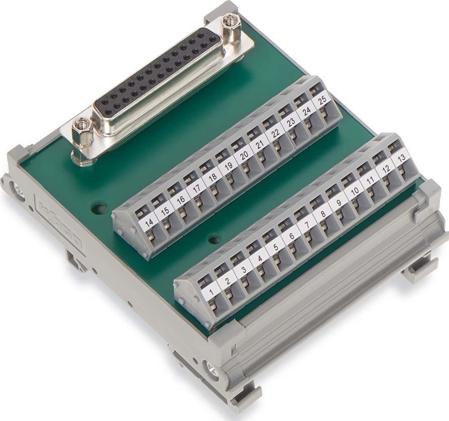 Modulo interfaccia; con pin a saldare; Connettore femmina; 25 poli; Controspina con connessione a saldare; Montaggio verticale; Morsetti per circuito stampato, doppia fila; nel supporto di montaggio; 2,50 mm²