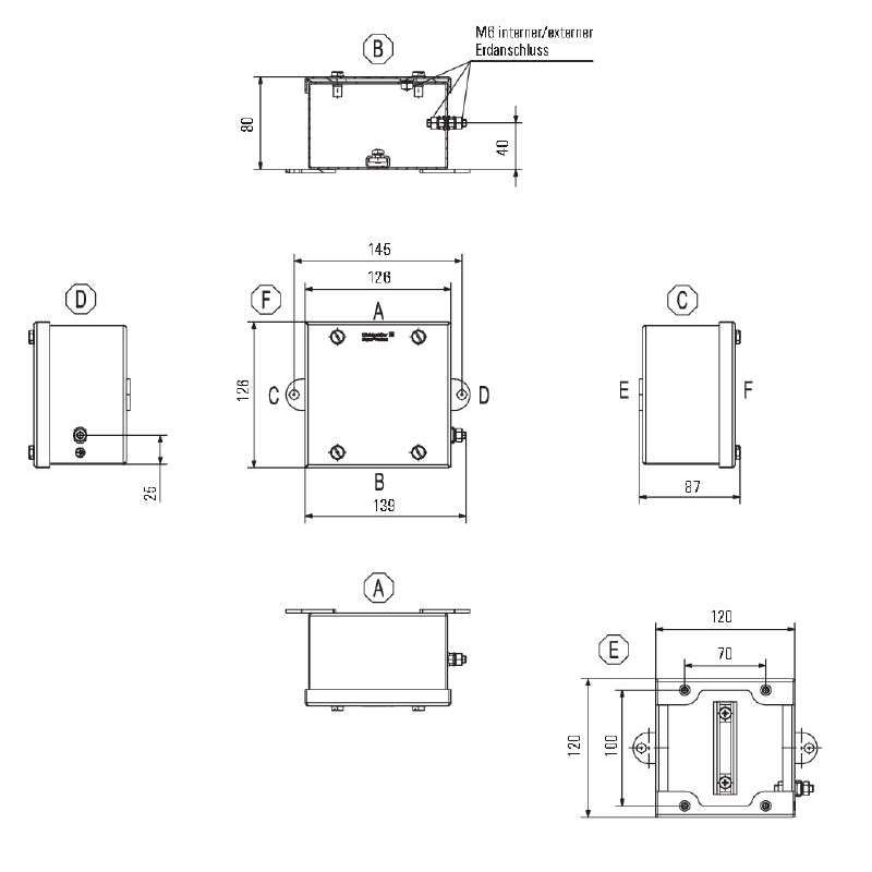 Custodia in metallo adatta all'uso in zone a rischio di esplosione. I fori per il montaggio sono posti all'esterno dell'area di tenuta stagna. Il montaggio a muro può essere realizzato utilizzando fori di montaggio o piedini di montaggio.