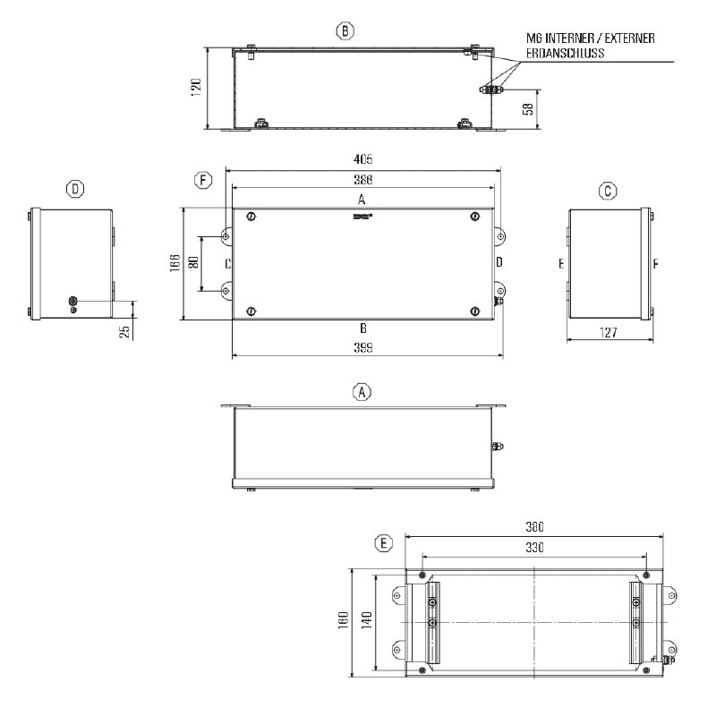 Custodia in metallo adatta all'uso in zone a rischio di esplosione. I fori per il montaggio sono posti all'esterno dell'area di tenuta stagna. Il montaggio a muro può essere realizzato utilizzando fori di montaggio o piedini di montaggio.