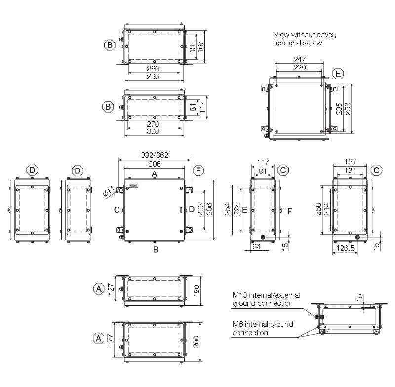 Custodia in metallo adatta all'uso in zone a rischio di esplosione. I fori per il montaggio sono posti all'esterno dell'area di tenuta stagna. Il montaggio a muro può essere realizzato utilizzando fori di montaggio o piedini di montaggio.
