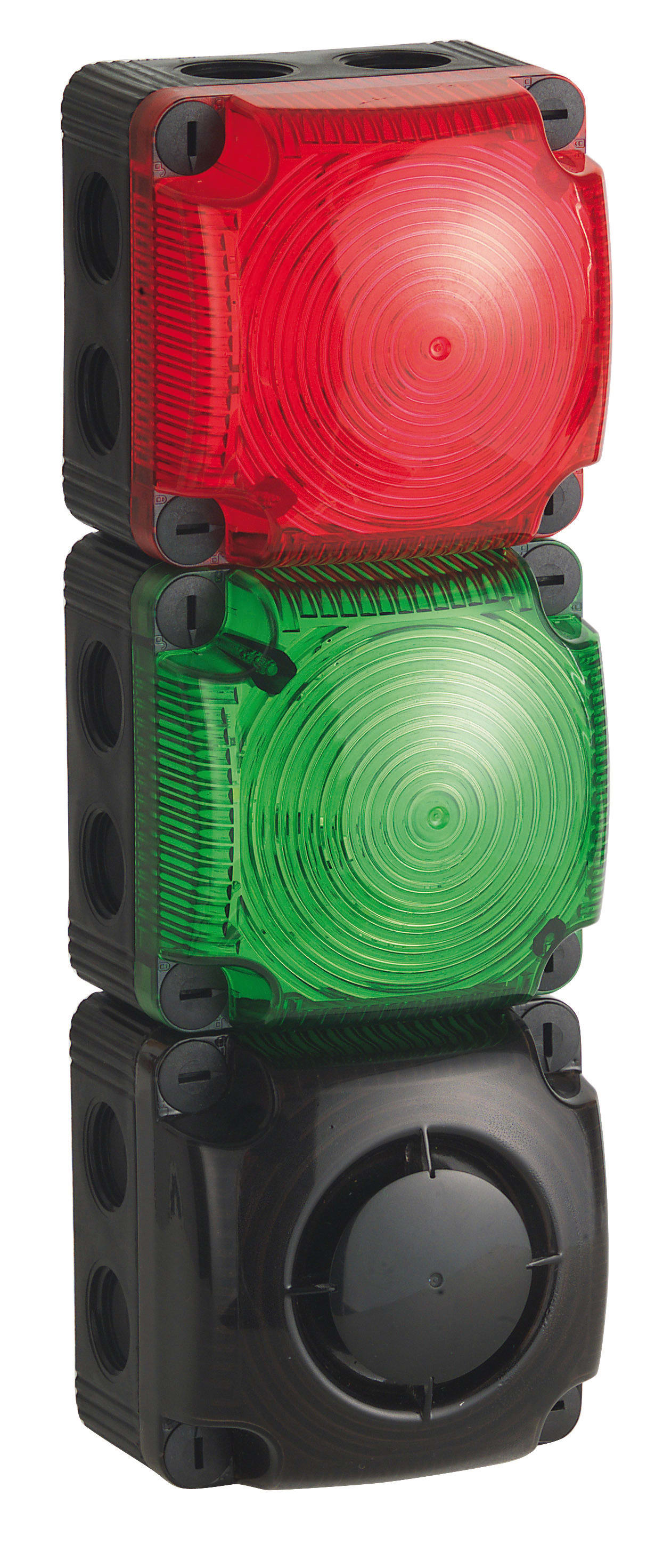 "Sirene mit ferneinstellbarer Lautstärke Fernsteuerbare Lautstärke (-10 dB) Optische Betonung des akustischen Signals durch eine Status- Beleuchtung"" Ideale Ergänzung zur LED-Leuchte 853 Beliebige Ampelkombinationen durch innovatives Verbindungsstück möglich"