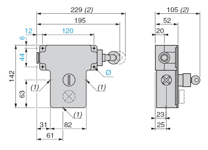 Interruttore arresto d'emergenza ad aggancio (cavo e molla d'estremitò da ordinare a parte) • Senza spia di segnalazione • Colore della cassetta: grigio RAL 7032 • Riarmo con pulsante con cappuccio • Contatti ad azione lenta • Ancoraggio del cavo a destra