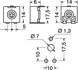 TRIMMER A STRATO DI CARBONE ACP 14x14 MONTAGGIO ORIZZONTALE REGOLAZIONE VERTICALE ROTORE CON TAGLIO PER CACCIAVITE. MAX POT. A 40° C:0,25W. MAX TENSIONE:250 VCC. ANG.ROTAZ.:265°±5°. TOLLERANZA:±20%. TEMP.LAV.:-25°÷+70°C. CURVA:lineare. PASSO:10x17,5 mm. CA14PV17,5-1MA2020-SH.